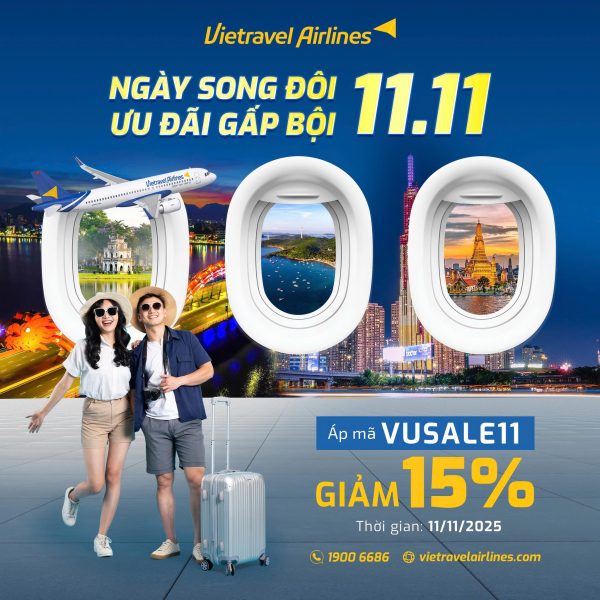 * Vietravel Airlines mở bán chương trình “Ngày song đôi, Ưu đãi gấp bội” chỉ cần nhập mã VUSALE11 bạn sẽ được giảm ngay 15% giá vé.