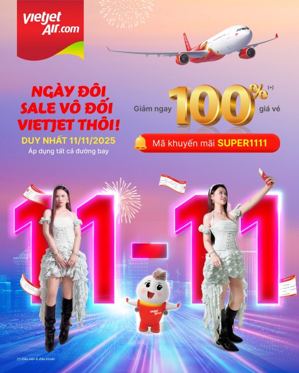 Chương trình diễn ra duy nhất trong ngày 11/11, từ 0h đến 23h (giờ Việt Nam). Khách hàng chỉ cần đặt vé và nhập mã “SUPER1111” tại website hoặc ứng dụng Vietjet Air để nhận ưu đãi.