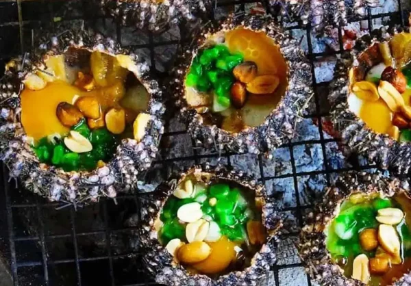 - Nhum nướng: Nhum biển nướng là một món ăn được rất nhiều người yêu thích của vùng biển Nha Trang bởi giá trị dinh dưỡng cao, cùng vị béo, mềm và rất dễ ăn của nó. Nhum nướng được nướng cùng mỡ hành cho mùi thơm ngất ngây, thêm một chút muối tiêu chanh. Món ăn chắc chắn sẽ làm cho bạn thử một lần rồi sẽ không quên được mùi vị đậm đà của nó.