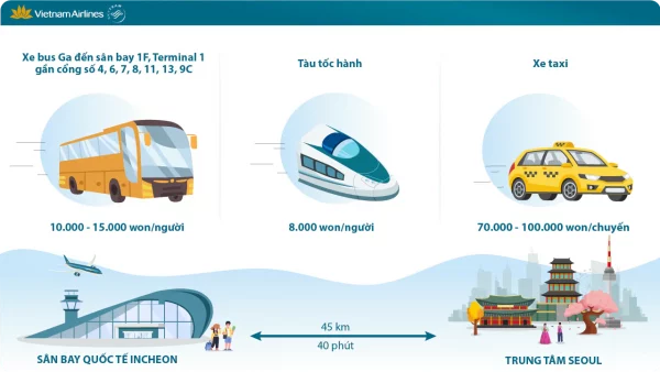Khoảng cách giữa trung tâm thủ đô Seoul đến sân bay quốc tế Incheon là 45km với thời gian di chuyển khoảng 40 phút. Một số phương tiện di chuyển dưới đây Quý khách có thể tham khảo