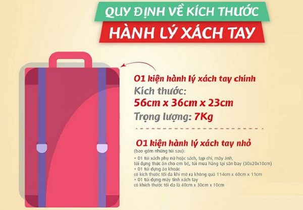 Mỗi một vé máy bay Viejet Air đã bao gồm 01 kiện hành lý xách tay chính có kích thước tối đa 56cm x 36cm x 23cm, và phải được dán nhãn hành lý xách tay của Vietjet tại quầy check-in. Trọng lượng hành lý xách tay Vietjet sẽ tùy theo hạng vé mà bạn mua (7kg – 18kg).