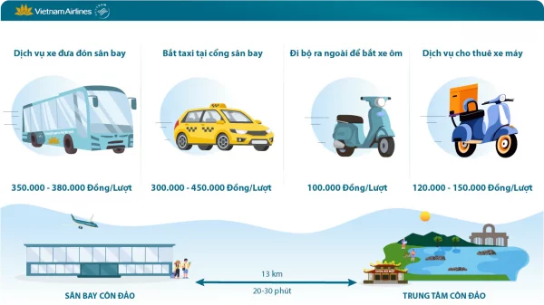 Nếu lựa chọn đi Côn Đảo bằng máy bay thì Quý khách sẽ cần di chuyển 13km từ sân bay về khu vực trung tâm thị trấn. Tại đây, du khách có thể lựa chọn những phương tiện sau: